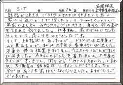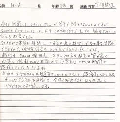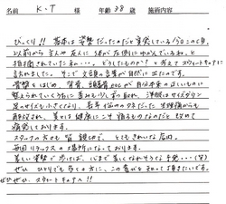 自分ではなかなか痩せられない肩や背中、足も細くなって周りの人から「痩せたね」といわれた時は本当に嬉しくて、サロンの方達に感謝の気持ちだいっぱいでした。食事の面でもなかなか調節が出来なくて友省的が残りましたが、3ヶ月で8キロもの減量が出来、見た目にもすっきりしたことで充分満足な結果がえられました。目標体重にはまだ届いていないのでこれからもアフターでお世話になりながら少しずつでも目標体重に近づけていけたらと思っています。