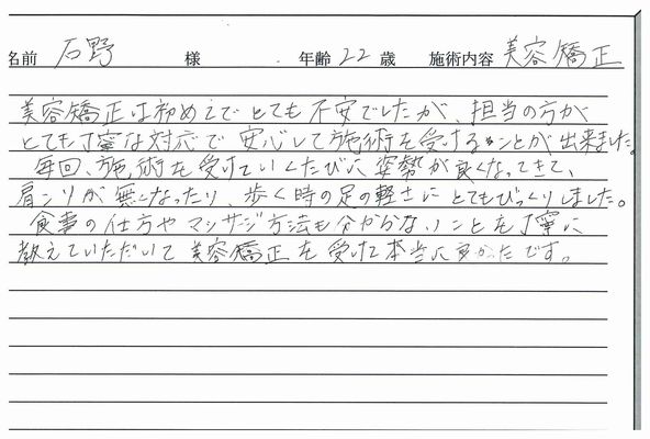 美容矯正は初めてでとても不安でしたが、担当の方がとても丁寧な対応で安心して施術を受けることが出来ました。